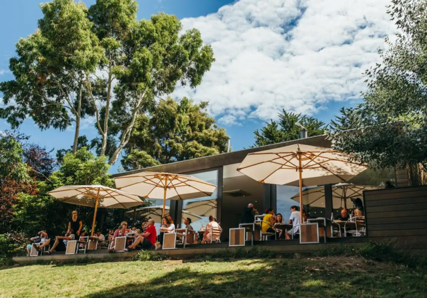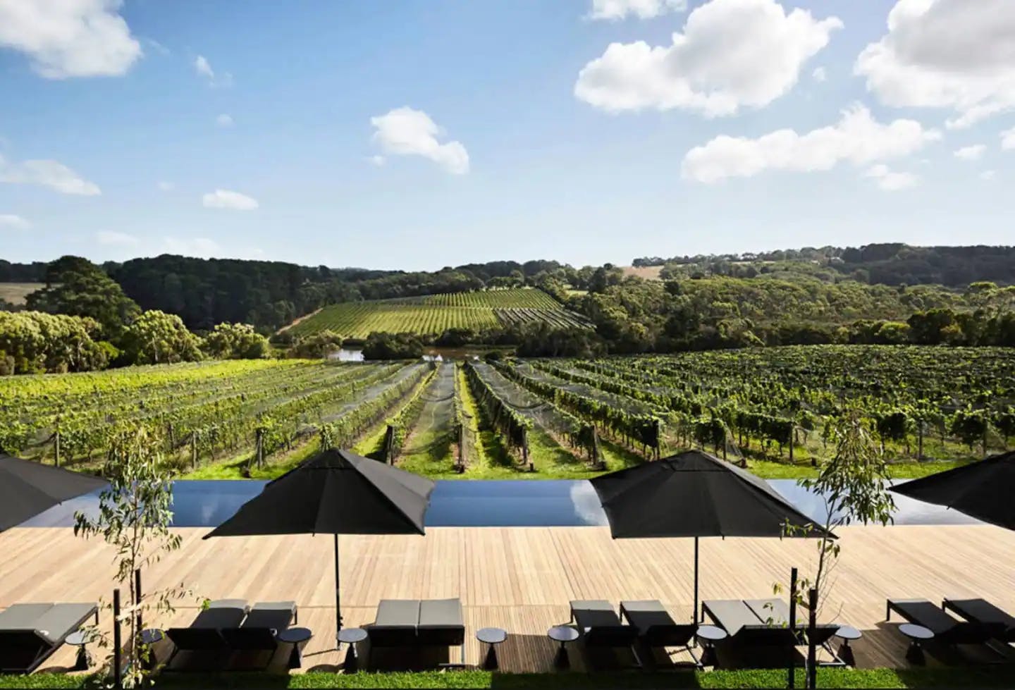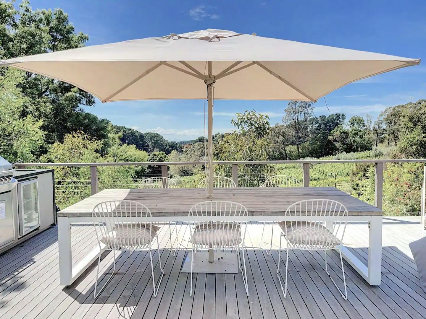 Sliding glass doors open up to a sunny house deck overlooking the gardens, leading to the main larger entertaining deck perched above the neighbouring vineyard, valley views and water glimpses on the western port bay in very distance
